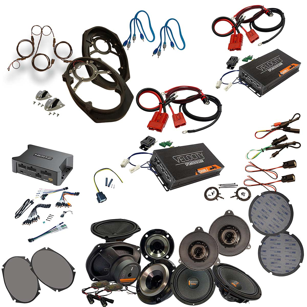 Dual 8ga amp power kit, fairing harness, bag harness, and expansion leads.