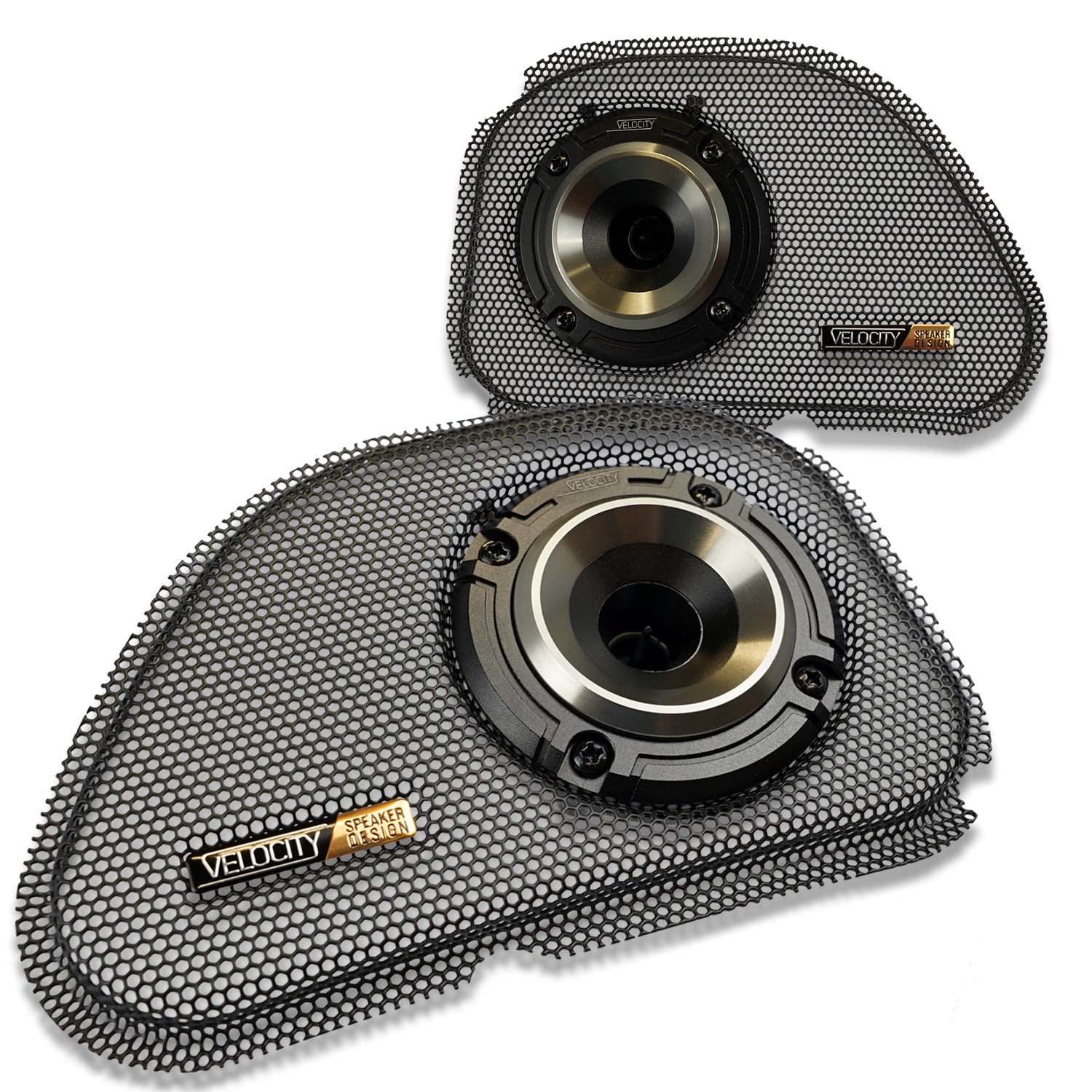 Add the best horn tweeters to your Harley Road Glide’s sound system with this bolt-in speaker grill replacement kit. The horns come pre-mounted in the grills with a sleek CNC-machined mounting plate. The grills feature a stamped recess for the horns, allowing them to sit flush for a clean, professional look. Specifically designed for 1998 through 2013 Harley Road Glide models, these grills are not generic add-ons but tailored to fit your bike perfectly.
